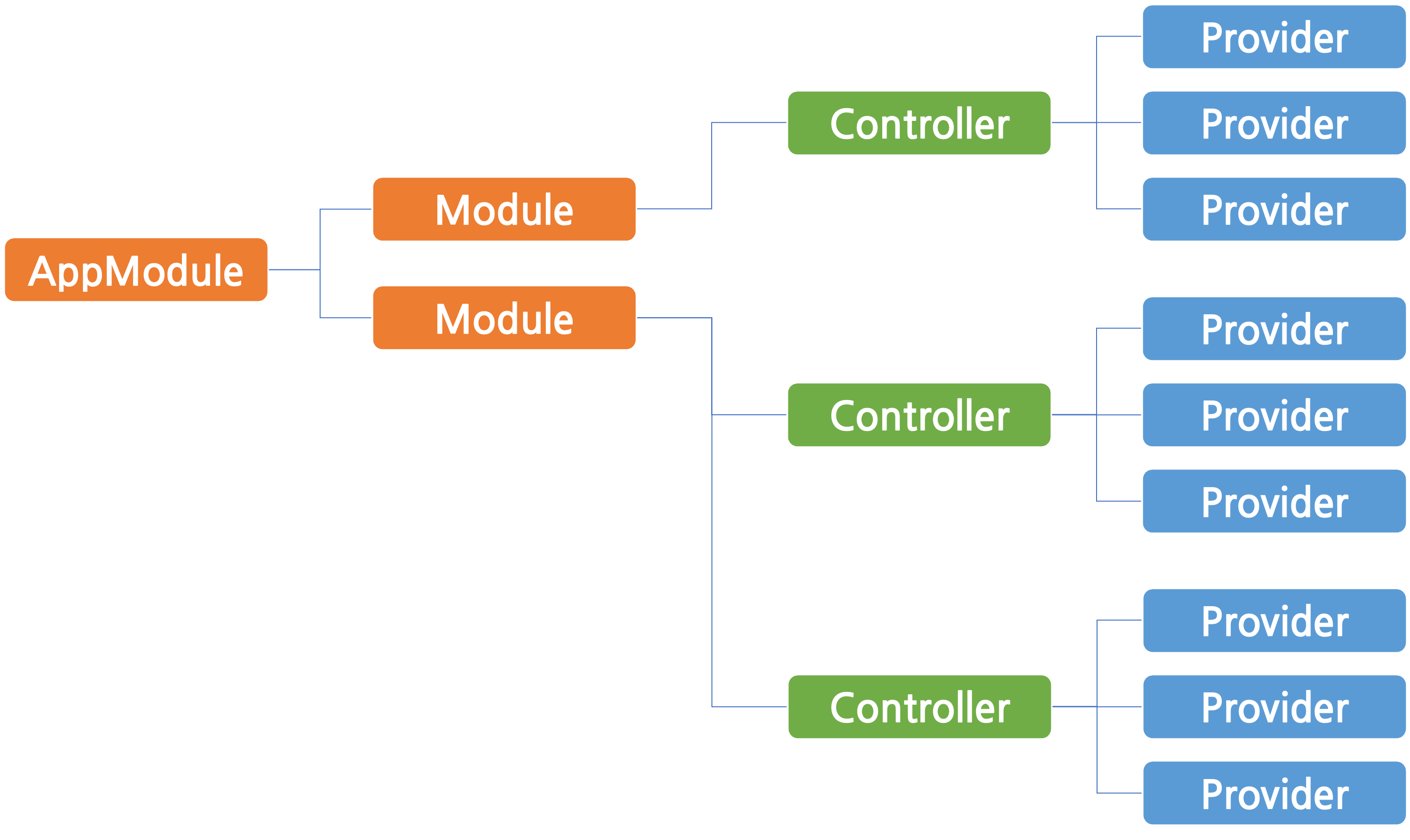 - Nest의 모듈, 컨트롤러, 그리고 프로바이더의 개념과 그것들의 관계에 대하여 설명합니다.